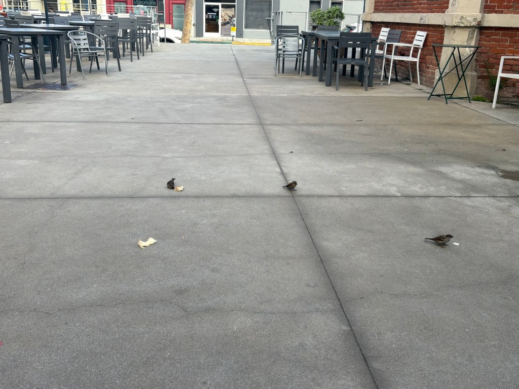 This is Abbott Square, the downtown gathering space in Santa Cruz. My son Zach and I start our morning here a couple days a week before he goes to his job, because our favorite coffee shop, Cat and Cloud, has a location there. I get my morning coffee and Zach gets a croissant. What you see here is the aftermath of Zach sharing some of his croissant with the small birds which frequent the Square. Zach loves to feed animals; he should have been a farmer.